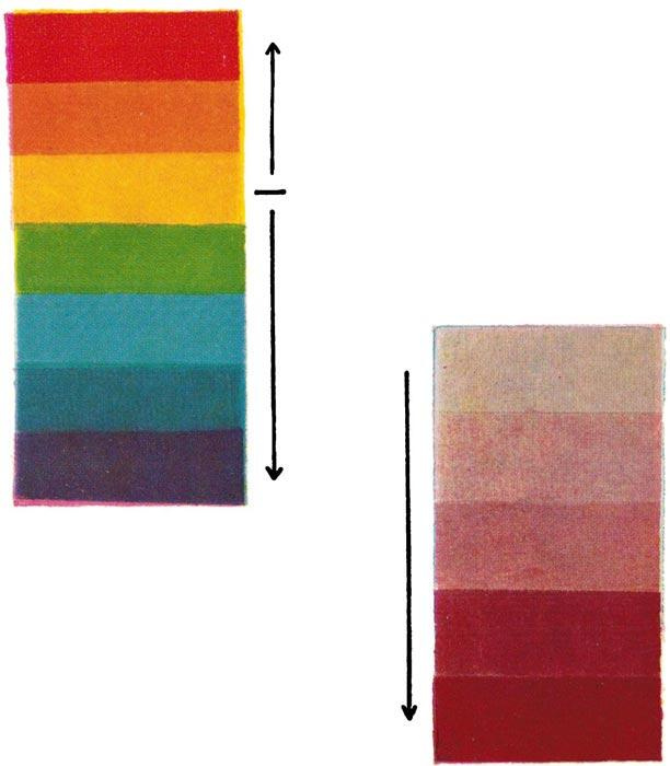 На «весовые» характеристики влияет также степень насыщенности и светлоты цвета. Равномерное изменение насыщенности и светлоты увеличивает или убавляет «тяжесть» в пределах одного тона (рис. 2). Светлые и малонасыщенные цвета самые легкие, темные и насыщенные тяжелые.