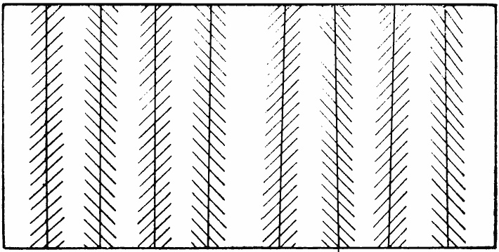 Близко к иррадиации цветов стоит возможность исправления дефектов формы с помощью различно направленных штрихов. Параллельные линии кажутся непараллельными, если их пересечь разнонаправленными штрихами (рис. 11). Таким же образом с помощью разнонаправленных штрихов непараллельность линий может быть исправлена, несогласованные по направлению линии могут быть согласованы.