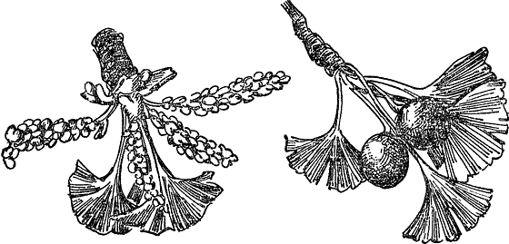 Наиболее известные заимствования из японского языка следующие. У любителей комнатных растений большим вниманием пользуется неприхотливое вечнозеленое деревце аукуба ( Aucuba japonica ). Некоторые ее формы имеют листья с разнообразными белыми и кремовыми точками, мраморными разводами, за что это растение называют еще золотым или колбасным деревом (а почему мы расскажем позже). По-японски оно именуется аокоба или аокиба (в переводе зеленое, вечнозеленое). Другой пример, Diospyros kaki такое латинское название дал Линней-младший японской хурме, использовав ее местное имя «каки-но-ки». Наконец, казалось бы, совсем по-японски звучит название «гинкго двулопастное» ( Ginkgo biloba ). А между тем это дерево не японское, поскольку в диком виде растет в восточном Китае, вблизи устья реки Янцзы и сохранилось там, по-видимому, с третичного периода. В культуре же гинкго довольно широко распространено в городах благодаря своей декоративности, долговечности и неприхотливости. В Китае, Корее, Японии гинкго издавна считалось священным деревом. А назвали его по плодам: «гин» на японском значит серебро, серебряный; «кио» абрикос (рис. 5).