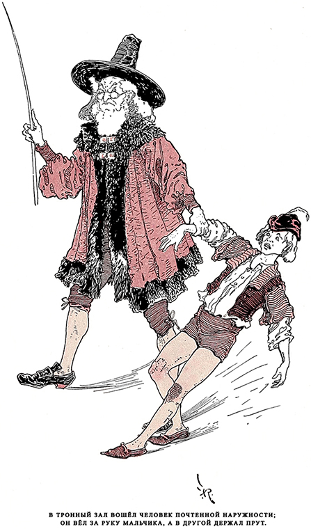 В тронный зал вошёл человек почтенной наружности. Он вёл за руку мальчика, а в другой держал прут.