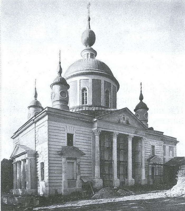 Никольский собор на 1200 человек сменил небольшую теплую церковь 17651768 гг. Представитель официального русско-византийского стиля, он строился по проекту А.А.Латкова с 1900 по 1904 г.; реставрирован Малхасовым в 1980-х гг. Собор сложен из кирпича, побелен по обмазке. В прошлом пятиглавый четырехстолпный храм без апсид принадлежит к центрическому крестовокупольному типу. Поставлен на глубоких, превышающих его площадь подвалах, из которых обращенный к Паже западный образует в береговом обрыве подпорную стенку. Внешняя архитектура отражает внутреннюю структуру здания. Плановому кресту на фасадах отвечают ризалиты с двумя ярусами окон и большой полукруглой закомарой. Собор венчает массивный, высоко поднятый на трибуне световой, внутри круглый, снаружи граненый барабан с куполом. Глухие купольные своды над пониженными закрестовьями служили опорой для малых, еще не восстановленных угловых глав. В декоре фасадов ведущий мотив колончатой аркатуры сочетается с широким использованием филенок и ленточного руста.