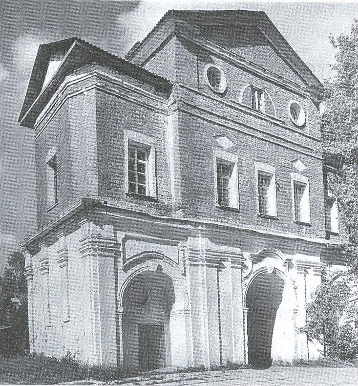 Трехчастные Святые ворота, обращенные в сторону Троицкой лавры, единственный в монастыре памятник архитектуры барокко. Сооружены из кирпича в середине XVIII в. в северной монастырской стене; в 1791 г. надстроены церковью Рождества Иоанна Предтечи, служившей приходской для окрестных деревень. При этом внешний северный фасад ворот в соответствии с архитектурой церкви переработан в суховатых формах классицизма. При сопоставлении частей здания особенно ощутима богатая пластика его изначального убранства с помощью крепованных пилястр, фигурных филенок, криволинейных сандриков. Характерны обилие и мелкий рисунок профилей. Архитектура церкви лапидарна. Двусветный одноглавый храм с пониженными объемами алтаря и притвора завершен фронтонами, перекрытия балочные. Прежнее убранство интерьера не сохранилось.