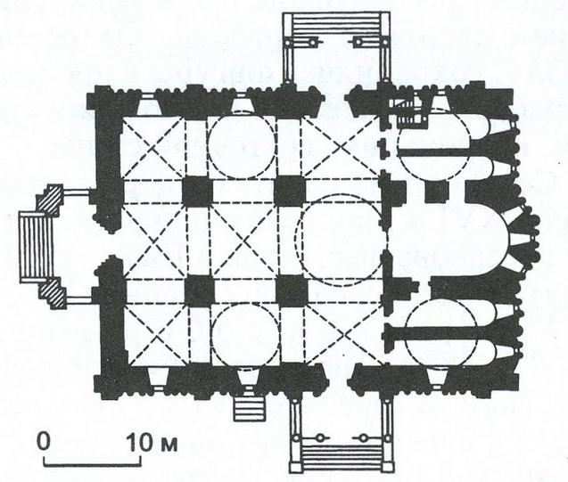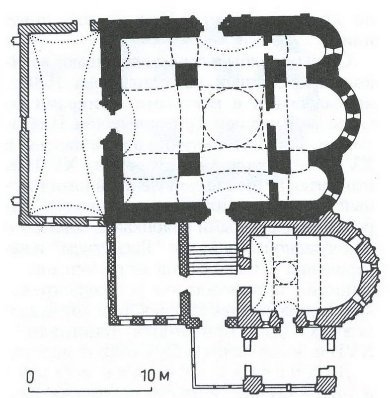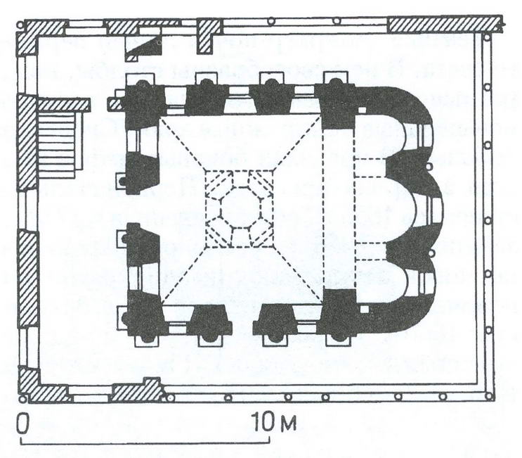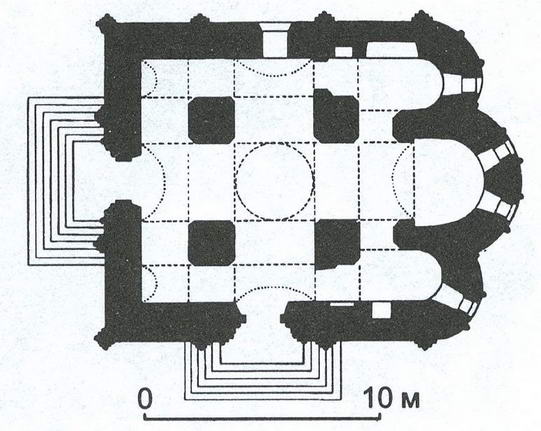 Темный интерьер почти лишен верхнего света. В нем своеобразны столбы, квадратные со скошенными углами, несущие повышенные подпружные арки. Своды