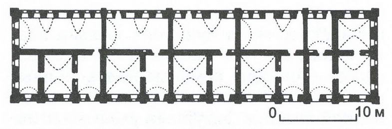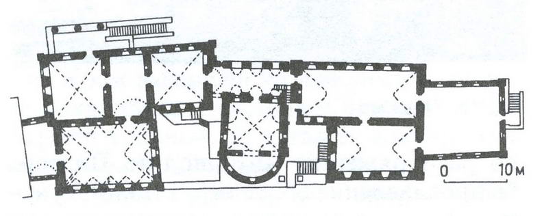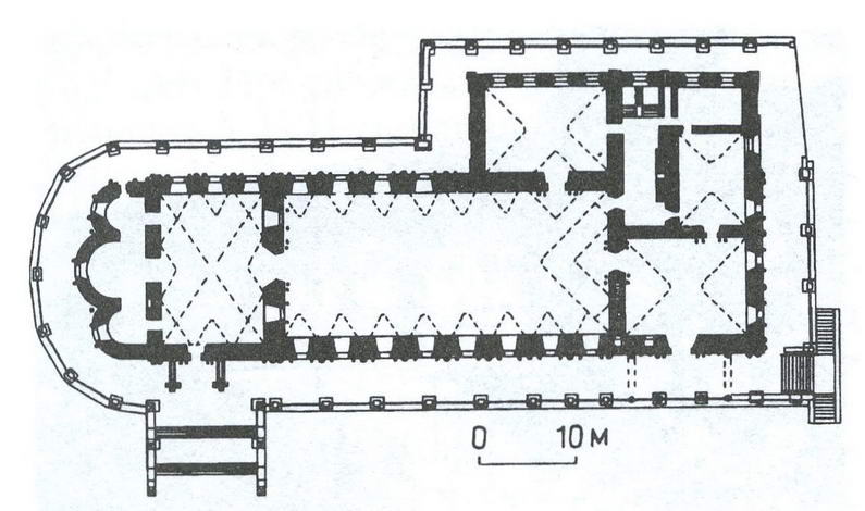 доминирует огромный трапезный зал, 34x15 м, для парадных обедов и приемов. Перекрытый полу лотковым сводом, он образует одно из крупнейших помещений своего времени без промежуточных опор. Для повседневного пользования предназначена малая трапезная в юго-западной части здания. Небольшая, смежная с главным залом бесстолпная трапезная церковь с лотковым сводом на распалубках занимает нижний ярус четверика, увенчанного маленькой главкой; в верхнем размещались монастырский архив и библиотека.