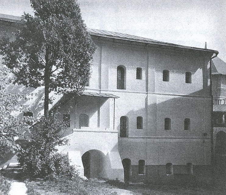 Представление о прежнем облике келий дает Предтеченский корпус, реставрированный В.И.Балдиным и А.Г-.Устиновым в 1960 г. Здание состоит из одинаковых в основном секций по три сводчатых помещения в каждой, с самостоятельными наружными входами. Эта система нашла отражение в членении фасадов лопатками, отвечающими положению внутренних стен. На беленых фасадных плоскостях выделяются своей нарядностью сохранившиеся участки фриза из полихромных ценинных изразцов, подоконники некоторых комнат сложены из глазурованного кирпича с зеленой поливой. В совокупности эти детали свидетельствуют о частичной перестройке корпуса в конце XVII в. На стенах помещений обнаружены следы панелей из чередующихся разноцветных вертикальных полос, вокруг окон и на откосах фрагменты опушек и орнаментальной росписи.