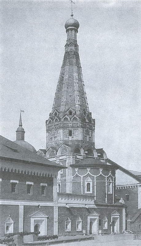 Кирпичная на белокаменных подвалах постройка отличается сложной живописной композицией. Два двухэтажных корпуса палат объединяет стройный шатровый храм на подклете, окруженный крытой папертью и площадками гульбищ. На одной из них стояла двухъярусная звонница на пять колоколов. Ранняя часть палат и особенно церковь имеют нарядный декор, во многом следующий формам XVXVI вв. Рамочные наличники с дыньками и треугольным фронтончиком, лопатки и вертикальные тяги с гирляндами, как у Духовской церкви, сочетаются с кокошниками в завершении стен и в основании шатра. В убранстве верха храма впервые