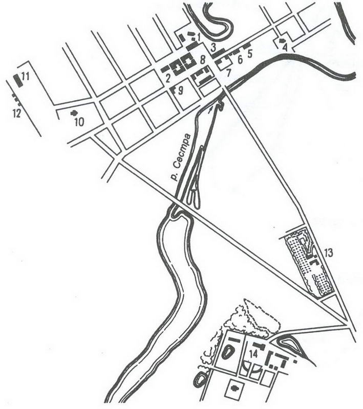 1 соборный комплекс ( 201); 2 торговые ряды ( 207); 3 гимназия ( 210); 4 Успенская церковь ( 203); 5 больница ( 208); 6 мещанская богадельня ( 205); 7 административный комплекс ( 204); 8 почтовый двор ( 206); 9 дом Орловых ( 214); 10 церковь Всех скорбящих Радости ( 202); 11 железнодорожный вокзал ( 209); 12 комплекс стандартных домов ( 211); 13 усадьба ( 212); 14 усадьба Демьяново ( 213)