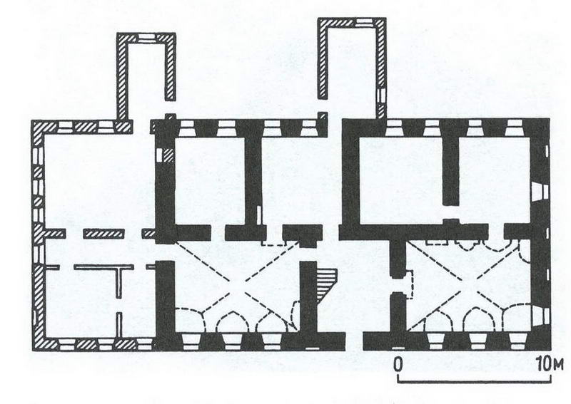 Идентичная планировка этажей образована капитальными стенами. В двух нижних помещениях имеются сомкнутые своды с распалубками над проемами.