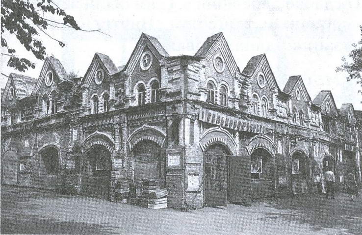 207. ТОРГОВЫЕ РЯДЫ (Советская пл., 2) сооружены вместо сгоревших деревянных в 18861888 гг. на пожертвования московского купечества. Созданные по проекту С.К.Родионова, они представляют собой обширный комплекс из шести преимущественно двухэтажных кирпичных корпусов сложной конфигурации. Принцип взаимного расположения и выраженная во вне секционная структура зданий основаны на старых традициях, восходящих к строительству гостиных дворов XVIII столетия. Отсутствует лишь внешняя обходная галерея, что сближает облик торгового комплекса с современным ему пассажем. За исключением одного, стоящего особняком одноэтажного корпуса с внутренним двором, остальные распланированы на двух взаимно перпендикулярных осях, образуя каре с широким поперечным проездом. Фасады зданий организованы ритмом венчающих щипцов, витринами нижнего и парными окнами верхнего этажа. Неоштукатуренные плоскости стен сплошь покрыты измельченным кирпичным декором в духе эклектики и псевдорусского стиля, заметно снижающим монументальность постройки.