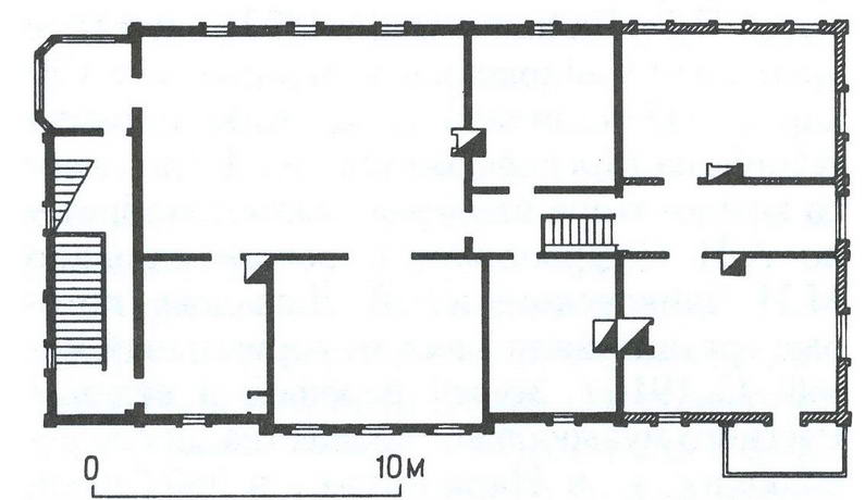 Основой внутренней планировки здания служит продольный коридор с двусторонним расположением комнат. Перекрытия главным образом плоские, но встречаются ребристые в виде кирпичных сводиков по металлическим балкам. В нижнем коридоре коробовый свод.