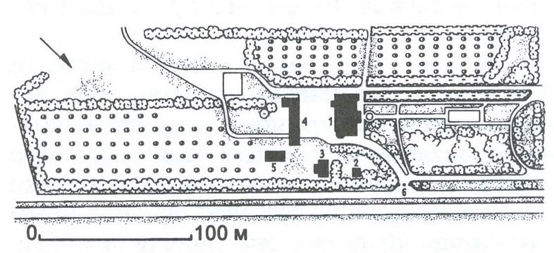 212/1. Усадьба. Генплан 1 дом; 2 погреб; 3 флигель; 4 хозяйственный корпус; 5 оранжерея; 6 ворота