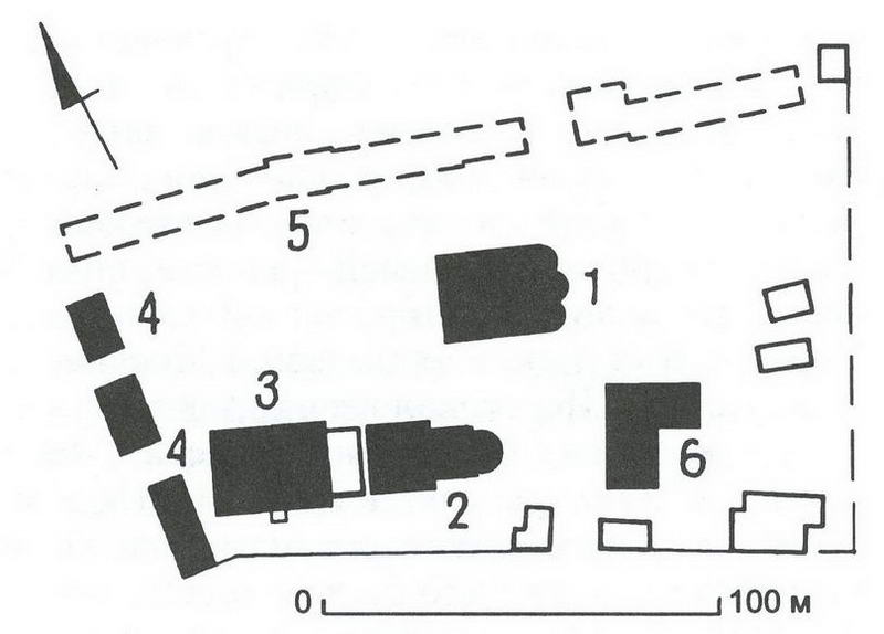 1 Преображенский собор; 2 Никитская церковь; 3 трапезная; 4 кельи; 5 место разобранных жилых и хозяйственных построек; 6 дом настоятельницы