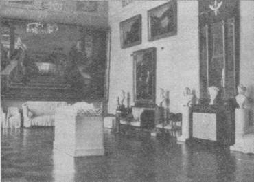 Мотивы росписей стен, где в медальонах размещены эмблемы искусств - палитра, лира, циркуль, несколько массивная мебель красного дерева в стиле позднего классицизма, усиленное системой зеркал освещение создают подходящий фон для восприятия картин Тьеполо.