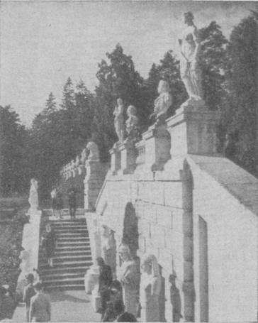 стоят мраморные группы «Амур и Психея» и «Кастор и Поллукс» - герои древнегреческих мифов (копии с античных оригиналов).