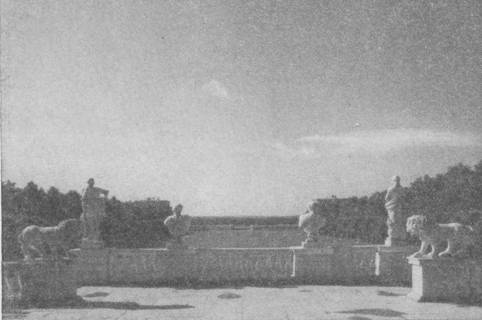 Вы спустились к большому партеру. Именно ему более всего обязан парк распространенным эпитетом «подмосковный Версаль». Действительно, это наиболее интересная часть парка с точки зрения садовой архитектуры и своей роли в общей композиции. Огромный прямоугольник партера (240 X 70 метров), окруженный стрижеными когда-то деревьями и рядами ритмично чередующихся скульптур, - по-видимому, самая старая часть парка. Партер рассчитан на восприятие в общем ансамбле, и мраморные скульптуры как бы подчеркивают его протяженность. Трудно предположить, чтобы в конце XVIII века, когда широкое распространение получили пейзажные парки, а регулярные сады вышли из моды, был устроен столь грандиозный партер. Судя по одному из рисунков, к 1786 году он уже существовал. Вероятнее всего, к началу строительства ансамбля эта часть парка уже имела в общих чертах планировку, оставшуюся от 30-х годов XVIII века, когда Д. М. Голицын начал создавать «французский сад» с «першпективными дорожками» и «партирами».