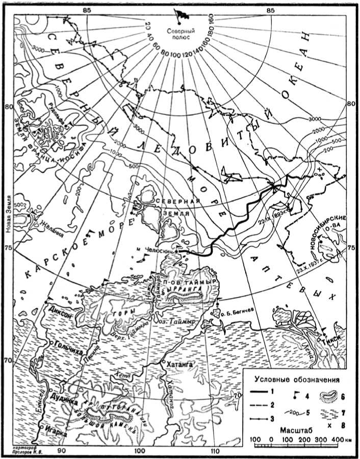 1. Путь гидрографического судна «Нерпа»; 2. Дрейф «Фрама»; 3. Дрейф «Седова»; 4. Полярные станции; 5. Изобаты (в метрах); 6. Горы и возвышенности; 7. Тундра; 8. Архипелаг Исчезающих Островов, открытый героями научно-фантастической повести «Земля Савчука».