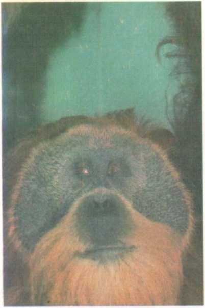 вида и зачастую угрожают ему. Орангутаны же, заметив в зеркале какой-то непорядок в своем «туалете» кусочки листьев, опилки на голове или пятна на шкуре, недолго раздумывая, удаляют их со своего тела. В Дуйсбургском зоопарке орангутаны скручивали из хлопка, который им давали для постройки спальных гнезд, трехметровые канаты, которые прикрепляли в качестве качелей к потолочным решеткам. Эти обезьяны обламывают ветки и используют их вместо лестниц; после тщательного изучения и обдумывания они ухитряются открывать сложнейшие запоры на дверях и умеют пользоваться инструментами. Правда, говорить они не умеют, точно так же как и другие человекообразные обезьяны, но тут причина кроется скорее в устройстве их гортани, чем мозга. Известны случаи, когда человекообразных обезьян обучали языку глухонемых и таким способом прекрасно с ними общались.