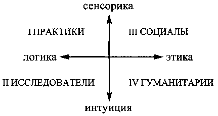 Следовательно, удобнее всего это обстоятельство отобразить на плоскости двумя взаимно перпендикулярными осями, одна из которых представляет собой шкалу логикаэтика, а другая сенсорикаинтуиция.