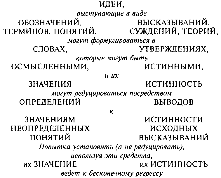 Слева в ней помещены слова или понятия и их значения, а справа высказывания (statements or propositions) или теории и их истинность.