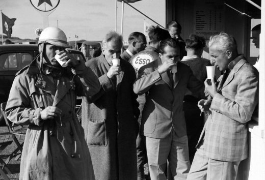 В боксах «Феррари» перед Большим призом Голландии 1953 года. Слева направо: Фарина, менеджер «Феррари», Аскари и Луиджи Виллорези.