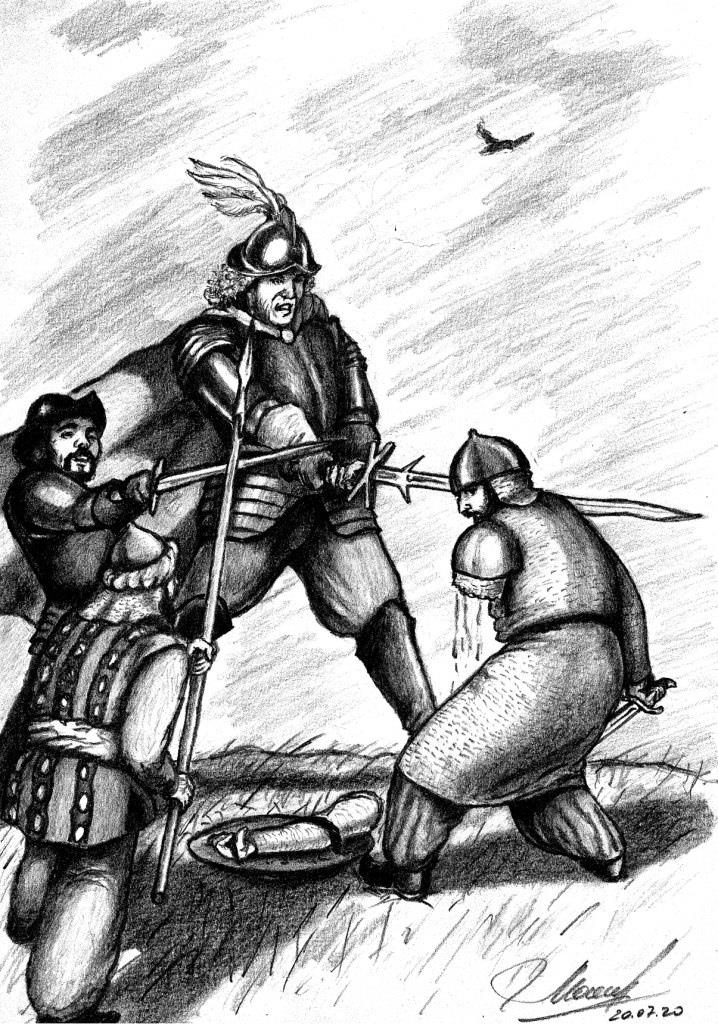 Высокий человек в роскошном доспехе пытался остановить бегство, перестроить ещё не безнадёжно утративших дух. Ангус, полуглухой от подшлемника и грохота боя, не услышал выстрела но он видел, как пуля пробила броню мятежного командира. Тот рухнул, и тело было затоптано бегущими.