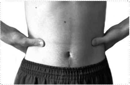 3. Если аритмия сопровождается недостаточным дыханием, используем для надавливания возбуждающие точки в подреберье (фото 5, в). Они расположены на расстоянии в ширину сомкнутой ладони от линии позвоночника. Выполняем ощутимое плотное надавливание одновременно на обе точки большими пальцами. Надавливание должно быть стандартным по времени (около 57 секунд), однако многократным.