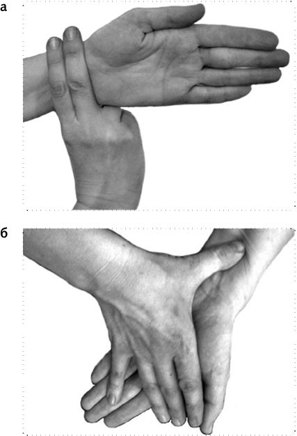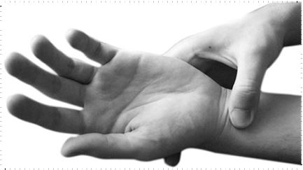 Для устранения физиологической аритмии воспользуемся приемом надавливания. Надавливаем точку, которая расположена на 2 пальца выше лучезапястной складки (см. фото 5, а).
