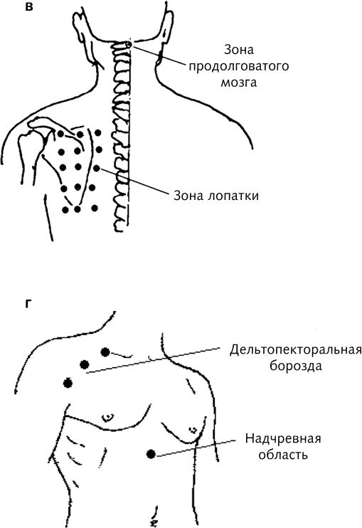 4. Зону лопатки (особенно левой), рис. 1, в.