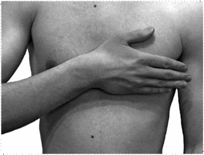 1. Правую ладонь кладем на грудь и плотно прижимаем к груди в таком положении: запястье находится в центре груди, пальцы обращены влево (фото 4). Надавливаем, массируя по направлению сверху вниз или же круговым движением по ходу часовой стрелки. Выполним сотню круговых движений или движений «вверх-вниз».