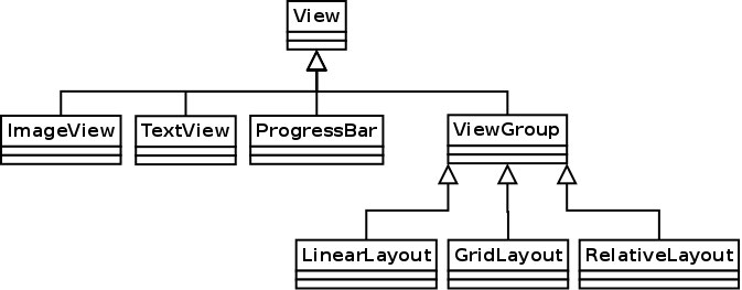 View. A partir dela é que são derivados todos os demais elementos como botões, imagens, checkboxes, campos para entrada e exibição de textos e também widgets mais complexos como seletores de data, barras de progresso e de pesquisa e até mesmo um widget para exibir páginas web, o WebView. A imagem abaixo mostra alguns deles: