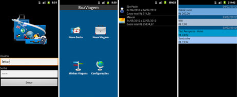 viagem. Esta informação poderá ser usada para que a aplicação nos alerte quando estivermos próximos de ultrapassar o limite de gastos estabelecido. Estas são as funcionalidades principais e no decorrer do livro aprenderemos outras coisas como a captura de fotos, uso do GPS e mapas, integração e compartilhamento de dados que você pode posteriormente incluir como nova funcionalidade do aplicativo. A imagem 3.1 mostra algumas de suas telas.