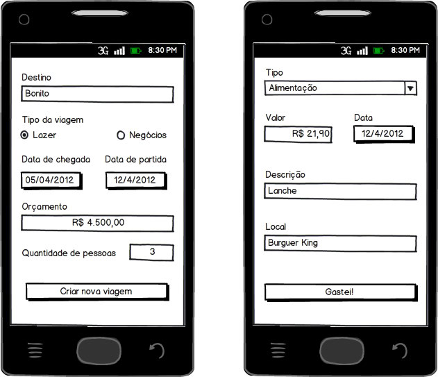 As próximas telas que iremos implementar serão a criação de uma nova viagem e o registro de um novo gasto. São telas tipicamente de cadastro e permitirão que sejam explorados diversos widgets para entrada de dados, tais como os Spinner, DatePicker e nosso já conhecido EditText, além de mais um tipo de layout, o
