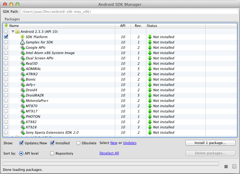 Neste momento o que temos instalado são apenas as ferramentas que fazem parte do Android SDK. Precisaremos agora selecionar e baixar as APIs para as quais pre-tendemos desenvolver nossas aplicações. Por enquanto, utilizaremos a versão 2.3.3