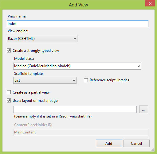 Use a layout master page: essa opção deve ser selecionada para criar uma view que utilize a Master Page já definida anteriormente.