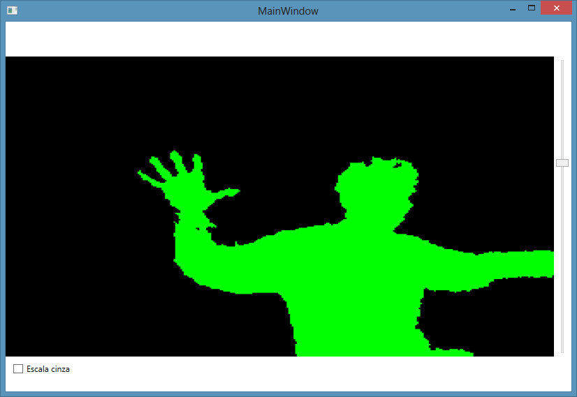 ção fará com que o nosso componente de imagem da aplicação exiba todo o cenário através do sensor de cores (como fizemos no capítulo anterior), mas utilizará escala cinza somente nos pixels que estão em uma distância menor que 2 metros do sensor.