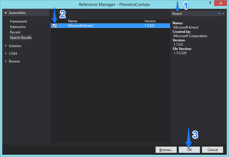 cation no Visual Studio e adicionar a referência para o SDK do Kinect.