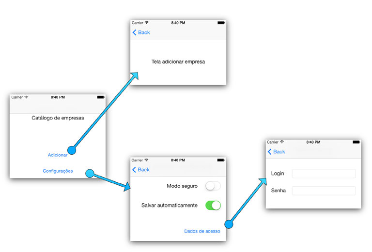 como as interações entre as muitas telas dos aplicativos irão ocorrer, tudo isso em um