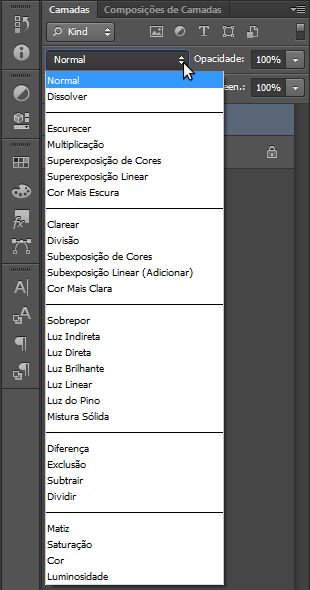 É permitida a filtragem por Modo, ou seja, os Modos de Mesclagem de camadas (que serão vistos ainda neste capítulo). Para adiantar, os modos são: