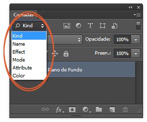 Na filtragem por Tipo, é possível selecionar quais camadas aparecerão no painel através destes pequenos ícones à direita, que indicam qual é o tipo que se quer usar