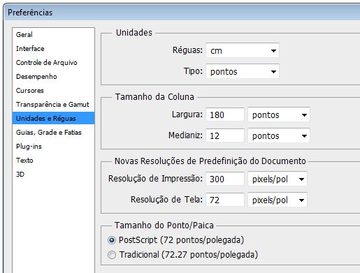 verá a janela Preferências, já posicionada em Unidades e Réguas.