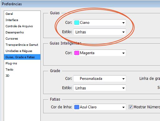 menu lateral Guias, Grade e Fatias, no qual é possível selecionar Cor e Estilo das guias.