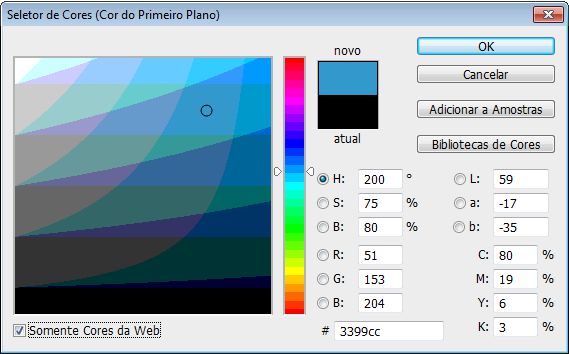 tonalidade mais clara deste azul, através de B, mostrado anteriormente, é muito mais fácil que, por exemplo, no S (já que o slider mostra os tons claros e escuros somente do azul, ao invés de todas as outras cores), bastando para a tarefa, arrastar um pouco para cima o slider até encontrar a tonalidade desejada.