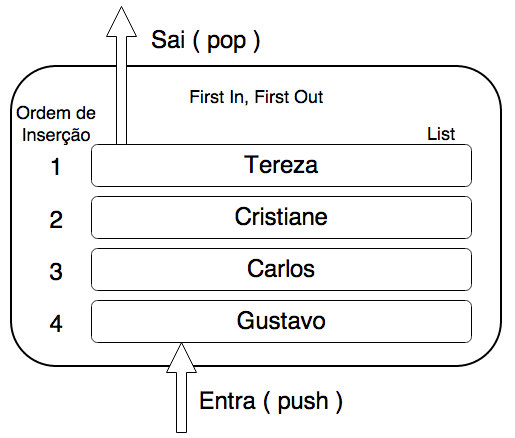 pessoas. Nesta fila, a primeira pessoa será a primeira a ser atendida; em seguida, a segunda pessoa será atendida e assim por diante, e você que chegou por último será também a última pessoa a ser atendida. Em outras palavras,