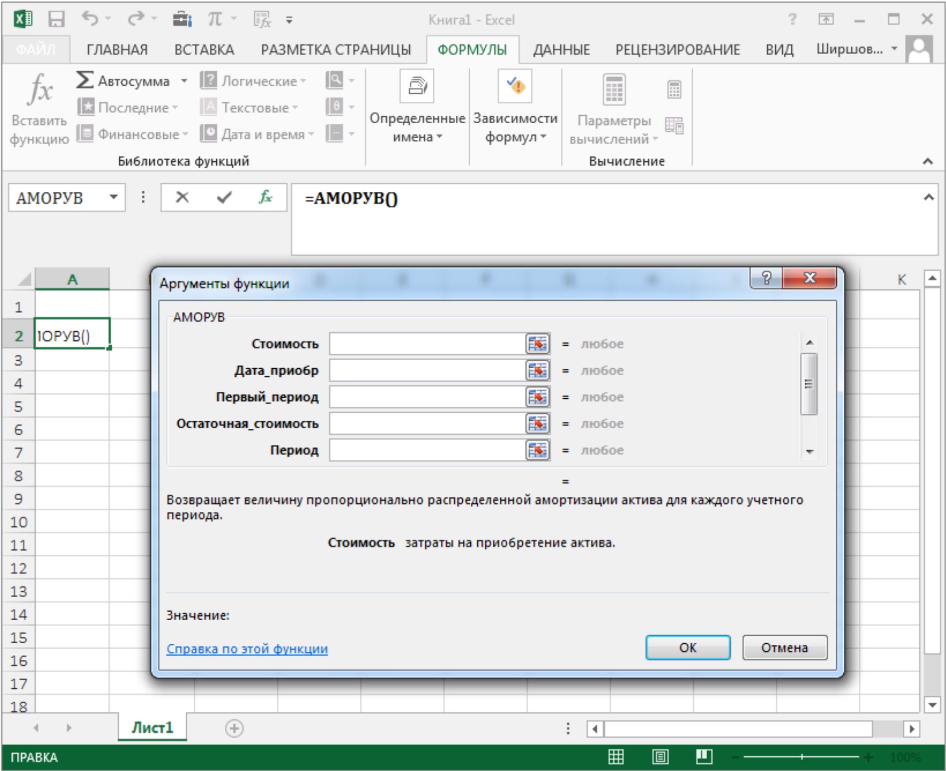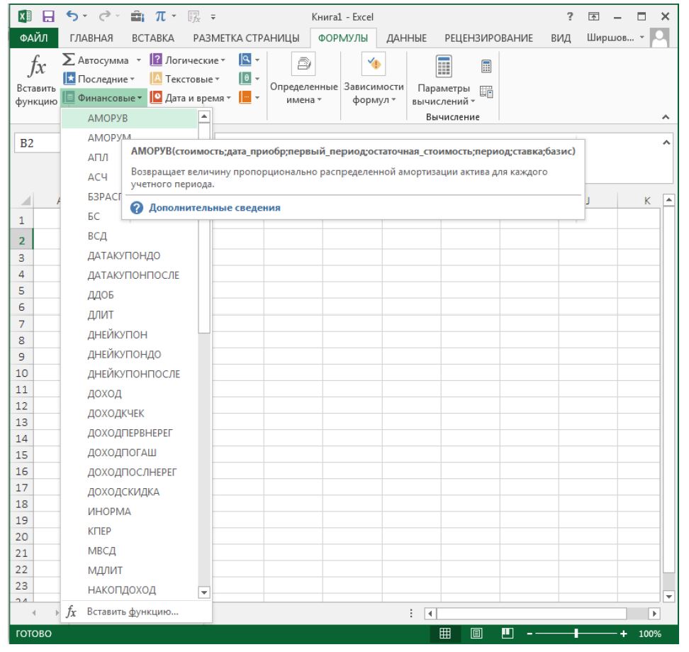 2. Для расчета результата финансовой функции Excel курсор устанавливается в новую ячейку для ввода формулы, использующей встроенную финансовую функцию; если финансовая функция вызывается в продолжение ввода другой формулы, данный пункт опускается.