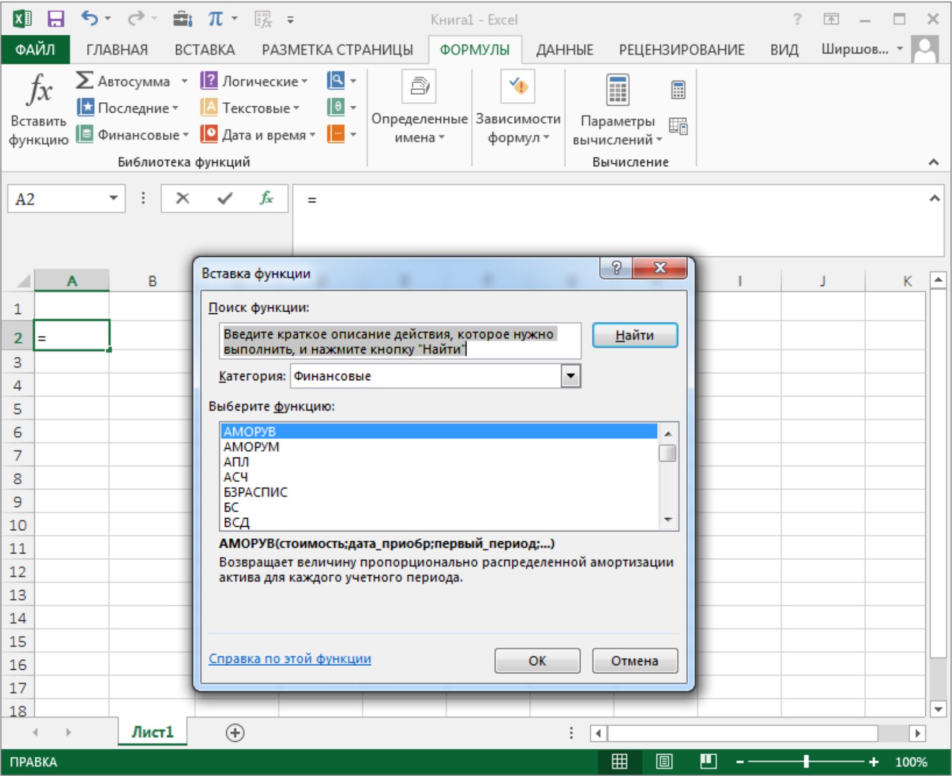 Рис. 2. Экран вызова опции Вставка функции