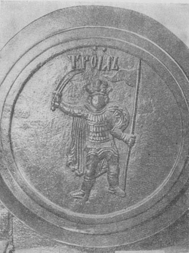 В центре торели фигура троянского царя со знаменем в левой руке и с мечом в правой. Царь изображен в пластинчатых доспехах, плаще и с круглым щитом за спиной.