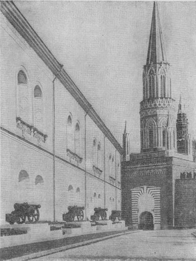 До постройки Арсенала Царь-пушка стояла на Красной площади, а в 1825 г. уже находилась на дворе Арсенала. Об этом свидетельствует один из путеводителей по Москве, составленный Сергеем Глинкой в 1825 г.