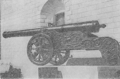 Пушка не имеет лафета, стоит в ряду мелких пушек.