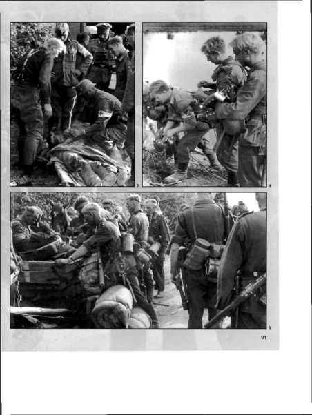 3. Санитар и группа солдат подбадривают раненого товарища перед его отправкой в лазарет.