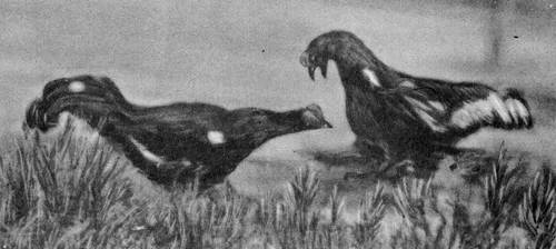 А сосед не боится! Собезьянничал и «подскок с повертушей», да ещё и нагло крикнул: «Чув-шии!» Ну, нахал, заслужил ты «наскока»! Теперь, краснобровый, держись! И вот «побегуша» и с ходу «наскок». Выпад и отскок как у бойца с рапирой: вперёд и назад, назад и вперёд! Сшиблись, как петухи, как в чехарде, один через другого. Наскок и отскок, наскок и отскок. Ага, испугался и побежал!